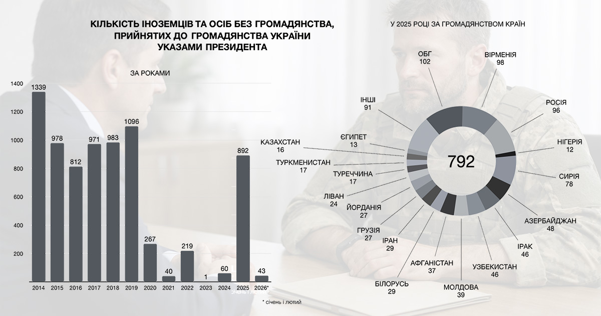 Вже з 2020 року цей показник різко скоротився: 267 осіб — у 2020 році й лише 40 — у 2021-му. В 2022 році відбулося коротке зростання до 219 осіб, але вже у 2023-му процедура фактично припинилася — громадянство отримала лише одна особа. У 2024 році показник дещо піднявся до 60, а у 2025-му відбулося різке відновлення: громадянство України указами Президента набули 892 іноземці та особи без громадянства.